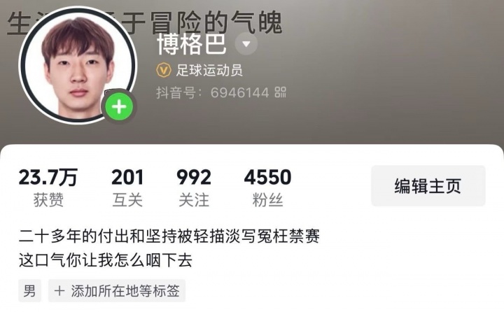 张浩的社媒主页上写着:二十多年的付出和坚持被轻描淡写冤枉禁赛 这口气你让我怎么咽下
