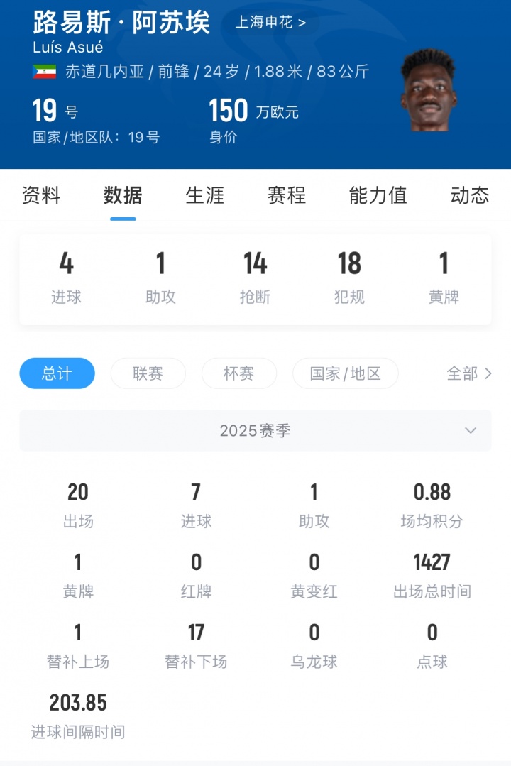 阿苏埃2025年6月加盟上海申花,上赛季为球队出场20次,贡献7球1助,他现身价150万欧,与申花合同至2027年。