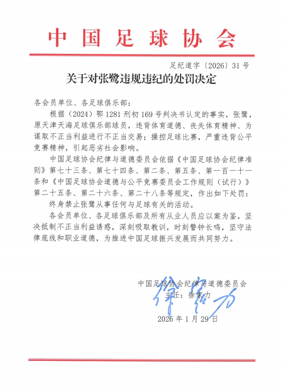 直播吧01月29日讯 足协发布“假赌黑”整治处罚结果,原天津天海足球俱乐部球员张鹭,违背体育道德、丧失体育精神、为谋取不正当利益进行不正当交易;操控足球比赛,严重违背公平竞赛精神,引起恶劣社会影响,被终身禁赛。