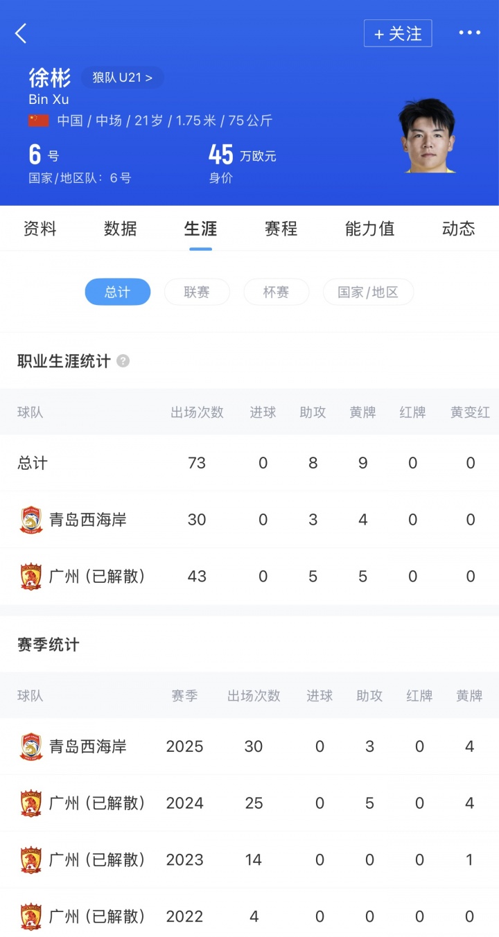 徐彬现年21岁,司职后腰,出身于广州恒大足校,他是恒大足校出品的首位男足国脚,2022年在广州队完成中超首秀,2025年1月徐彬自由身加盟青岛西海岸。2025赛季,徐彬代表青岛西海岸出战30场比赛,其中在中超出战27场,贡献3次助攻。