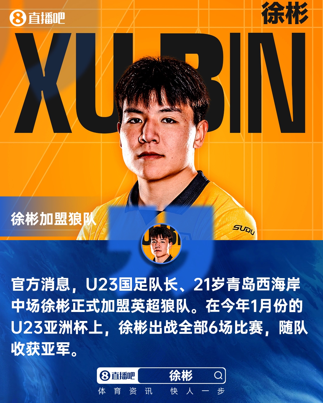 直播吧01月30日讯 英超球队狼队官方消息,U23国足队长、21岁青岛西海岸中场徐彬自由身转会加盟,球员并将在本赛季剩余时间在英格兰国内联赛完成租借!与直播吧此前的独家报道一致。