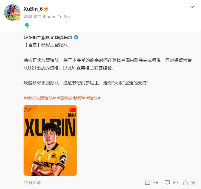 开启留洋!徐彬转发狼队官宣微博,配上四叶草的表情