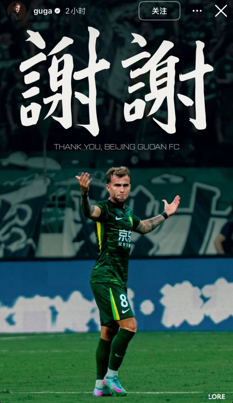 在官宣加盟后,古加在社媒晒出自己身披国安球衣时的海报,向效力两年的北京国安致谢。