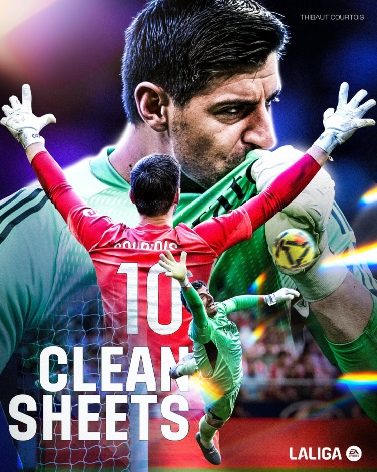 争夺金手套占先机!库尔图瓦是本赛季西甲首位达成10场零封的门将