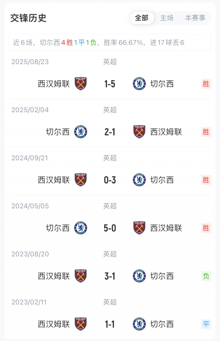 切尔西联赛10胜7平6负积37分暂位英超第5,各项赛事已获四连胜;西汉姆联联赛5胜5平13负积20分暂位英超第18,各项赛事目前也获得了三连胜。切尔西对阵西汉姆联已获四连胜。