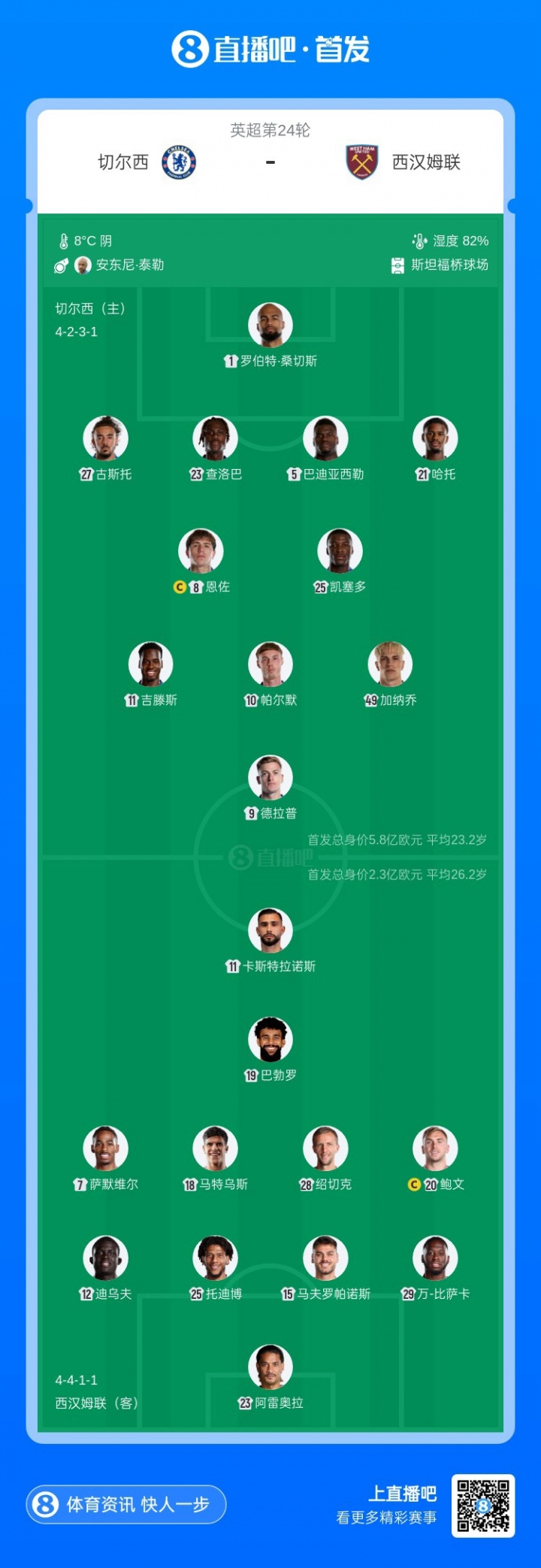 切尔西首发:1-桑切斯、27-古斯托、23-查洛巴、5-巴迪亚西勒、21-哈托、25-凯塞多、8-恩佐、11-吉滕斯、10-帕尔默、49-加纳乔、9-德拉普