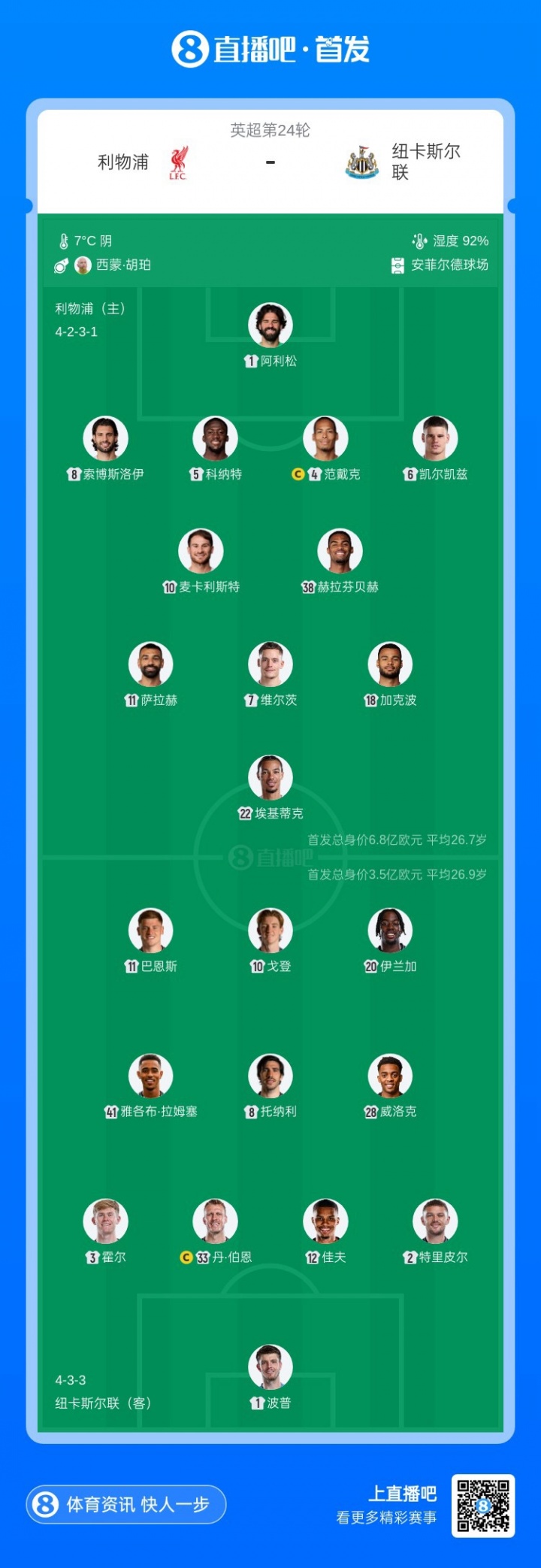直播吧2月1日讯 英超第24轮,利物浦主场迎战纽卡比赛即将打响。赛前首发出炉。