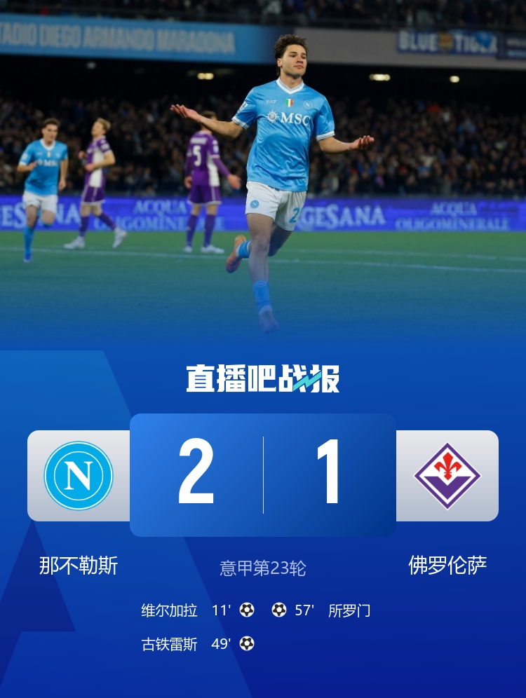 直播吧2月1日讯 北京时间2月1日凌晨1时整,2025-26赛季意甲第23轮在马拉多纳球场展开角逐,那不勒斯主场迎战佛罗伦萨。上半场维尔加拉意甲处子球,迪洛伦佐伤退,下半场维尔加拉助攻,古铁雷斯扩大比分,所罗门扳回一城。最终那不勒斯主场2-1战胜佛罗伦萨,那不勒斯终结各赛事3场不胜,先赛积46分升至第3名。