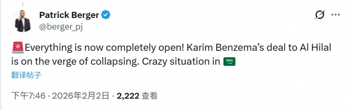 德天空记者Patrick Berger转发了此前本泽马接近加盟新月的报道,并表示:现在一切都充满变数!本泽马加盟利雅得新月的交易濒临破裂。沙特联赛转会情况真是太疯狂了。