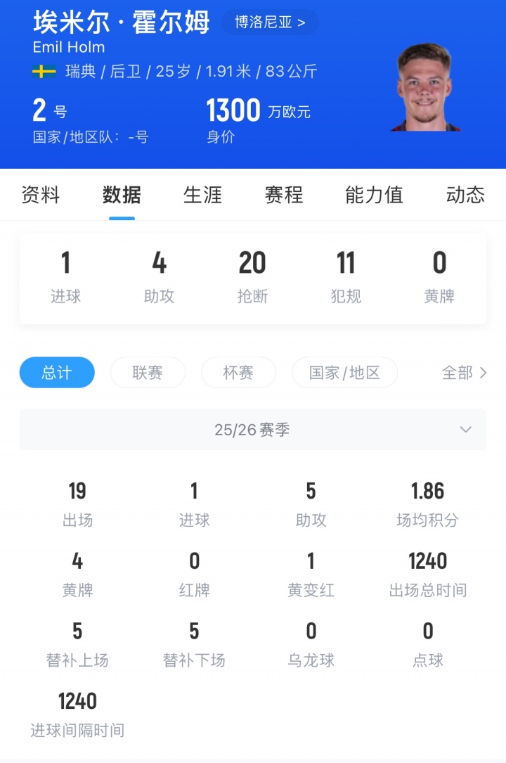 霍尔姆现年25岁,瑞典右后卫。本赛季为博洛尼亚出战19场比赛1球5助,德转身价1300万欧元。