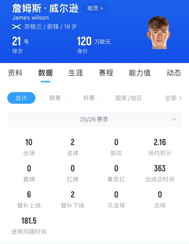 詹姆斯·威尔逊本赛季为苏格兰超哈茨出场10场比赛,贡献2粒进球,目前其德转身价为120万欧。