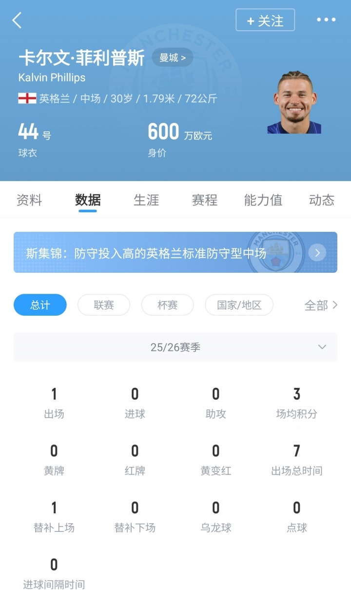 菲利普斯,现年30岁,英格兰中场,本赛季仅代表曼城出战1场比赛,总计7分钟,目前德转身价600万欧。