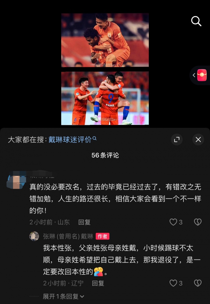 戴琳回复:“我本姓张,父亲姓张母亲姓戴,小时候踢球不太顺,母亲姓希望把自己戴上去,那我退役了,是一定要改回本姓的。”