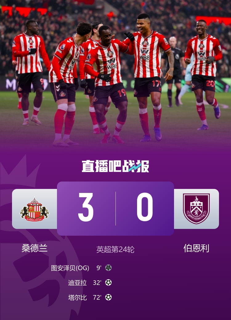 直播吧2月3日讯 北京时间4:00,英超第24轮桑德兰vs伯恩利。上半场,迪亚拉梅开二度。下半场,杜布拉夫卡贡献神扑;塔尔比世界波再下一城!最终,桑德兰3-0完胜伯恩利,升至英超第8;伯恩利遭遇15轮不胜!