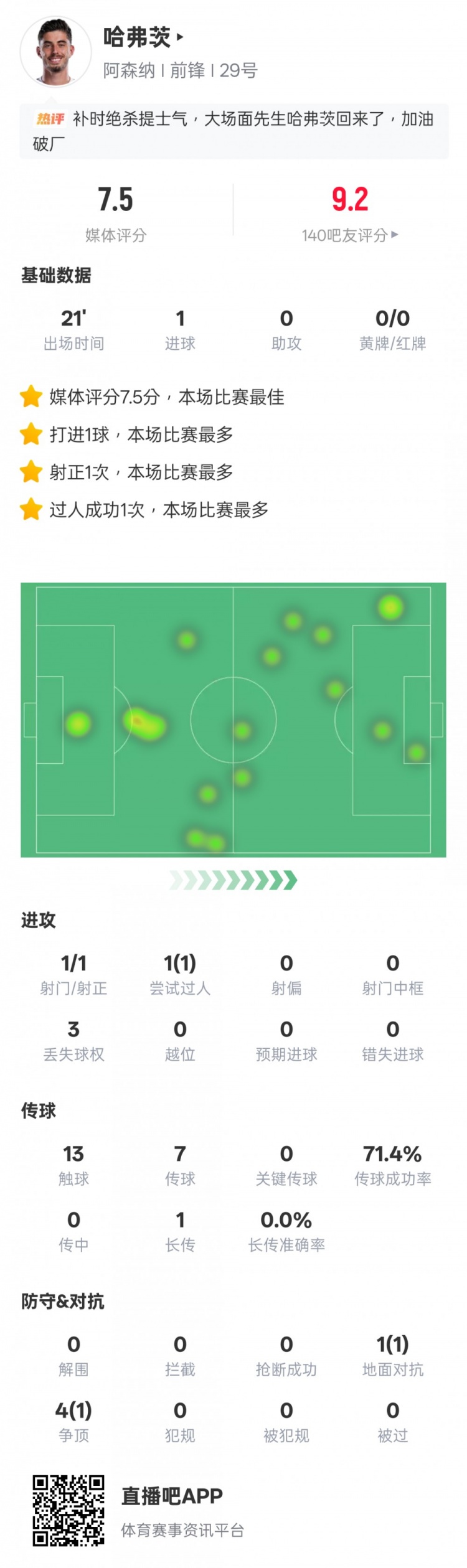 直播吧2月4日讯 联赛杯半决赛次回合,阿森纳1-0战胜切尔西,总比分4-2晋级决赛。本场比赛,哈弗茨替补登场,打进1粒进球,1次过人成功,评分7.5并列全场最高。