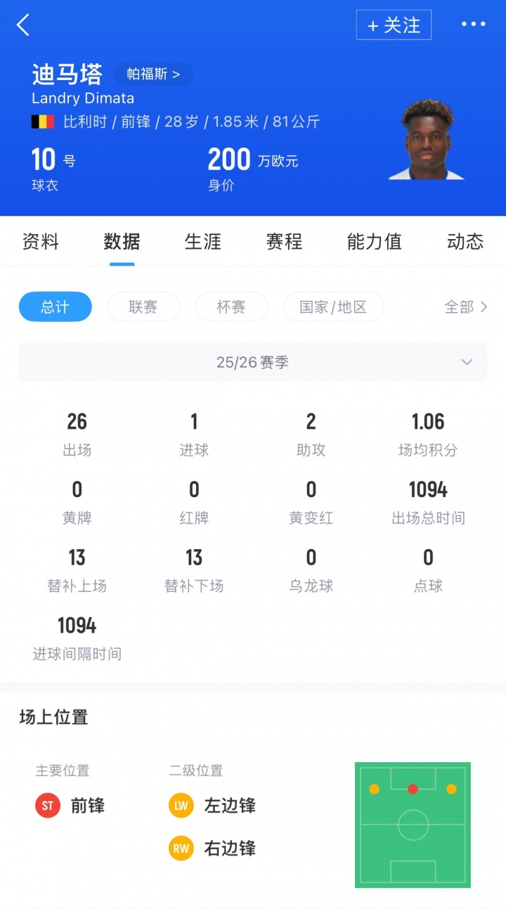 兰德里·迪马塔,1997年9月1日出生,身高1米85,场上司职前锋,具备出色的速度与冲击力,拥有丰富的欧洲顶级联赛及欧冠赛事经验,曾效力于沃尔夫斯堡、安德莱赫特、西班牙人、奈梅亨、萨姆松体育等欧洲知名球队,2025年夏天加盟塞浦路斯帕福斯队。迪马塔在效力安德莱赫特期间,共出战38场,取得15球5助的数据。2021-2022赛季,他代表西班牙人出战38次,收获5球1助攻。2022-2023赛季代表奈梅亨征战荷甲期间,他出战32场贡献了10球2助攻。2023-2025赛季,他代表萨姆松体育在土超出战57场,斩获9球4助攻。2025-2026赛季,迪马塔代表帕福斯出战22场,贡献1球2助攻,其中欧冠赛场出战6次,展现出极强的竞技状态与职业素养。