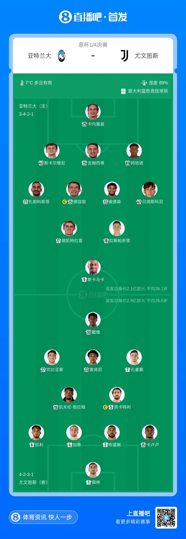 直播吧02月06日讯 意大利杯8强阶段,亚特兰大对阵尤文比赛即将打响。赛前首发出炉。