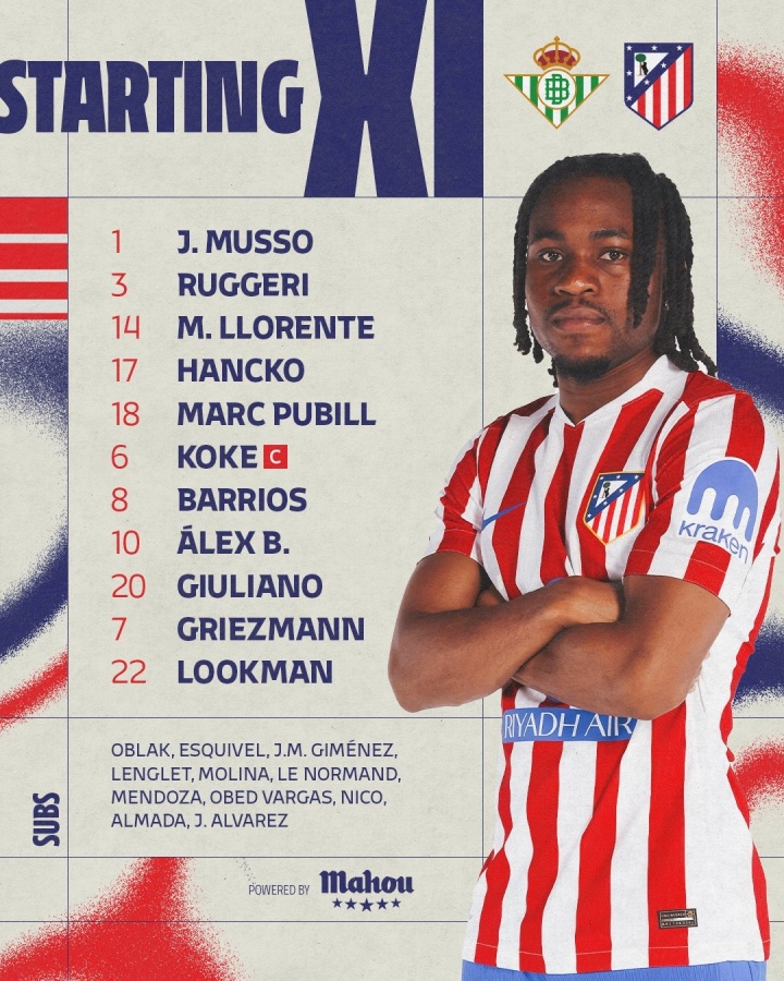 1-穆索、3-鲁杰里、14-马科斯·略伦特、17-汉茨科、18-普比尔、6-科克、8-巴里奥斯、10-巴埃纳、20-朱利亚诺·西蒙尼、7-格列兹曼、22-卢克曼