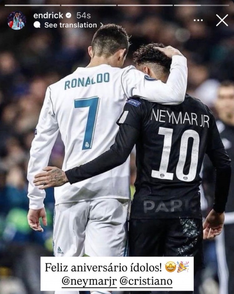 在社交媒体上,恩德里克晒出了C罗和内马尔在球场上的照片并写道:生日快乐,偶像!