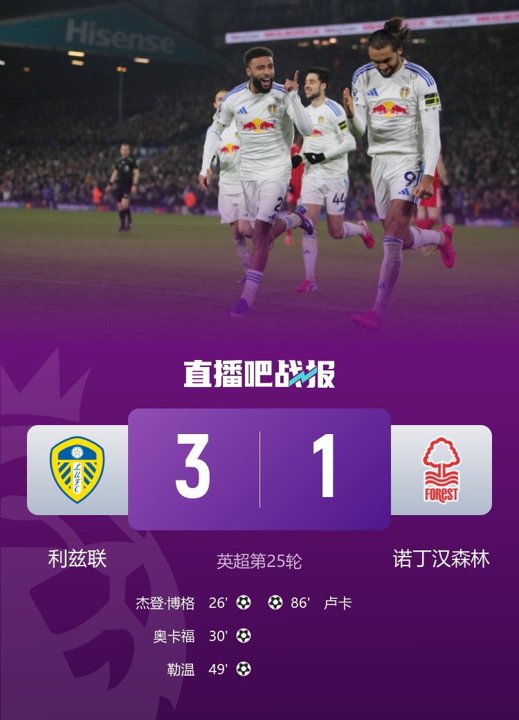 直播吧2月7日讯 英超第25轮,利兹联坐镇主场埃兰路球场迎战诺丁汉森林。上半场,博格、奥卡福破门,勒温中框。易边再战,勒温再进一球,卢卡扳回一城。最终利兹联3-1诺丁汉森林。积分榜方面,利兹联29分第16,森林26分第17。