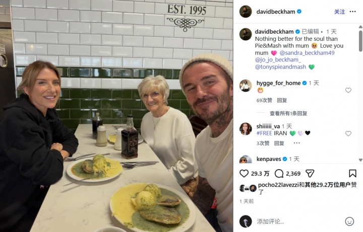 贝克汉姆在社媒配文:没有什么比和妈妈一起吃馅饼土豆泥更能治愈心灵的了🥹爱你老妈🩷