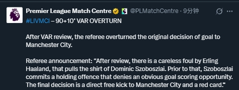 裁判现场宣布:经视频回放确认,哈兰德有一次鲁莽犯规,拉拽了索博斯洛伊的球衣。在这之前,索博斯洛伊也有一次拉人犯规,破坏了一次明显的得分机会。最终判罚曼城获得直接任意球,并向索博斯洛伊出示红牌。