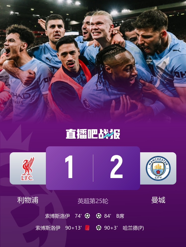 直播吧2月9日讯 北京时间2月9日凌晨0时30分,2025-26赛季英超第25轮焦点战在安菲尔德球场展开角逐,利物浦主场迎战曼城。上半场哈兰德失单刀,红军零射正,下半场埃基蒂克失良机,索博任意球世界波+补时染红,B席扳平,哈兰德传射+点球绝杀。最终曼城客场2-1逆转双杀利物浦,蓝月联赛3轮不败,红军近7轮仅1胜,曼城积50分位居第2距榜首阿森纳6分,利物浦积39分名列第6距前四5分。