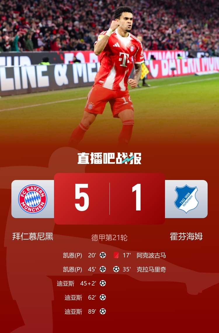 直播吧2月9日讯 北京时间2月9日0点30分,德甲第21轮,拜仁慕尼黑在主场安联竞技场对阵霍芬海姆。上半场,迪亚斯造点,阿克波古马染红,凯恩点射破门,阿斯拉尼头球中框,诺伊尔失误送礼,克拉马里奇版平板比分,半场结束前迪亚斯再度造点,凯恩点射双响,迪亚斯补时自己打进一球。下半场,迪亚斯完成帽子戏法,凯恩射中横梁。最终拜仁慕尼黑5-1击败霍芬海姆。本场比赛过后,拜仁慕尼黑积54分,以6分优势领跑积分榜,霍芬海姆积42分排在联赛第三。