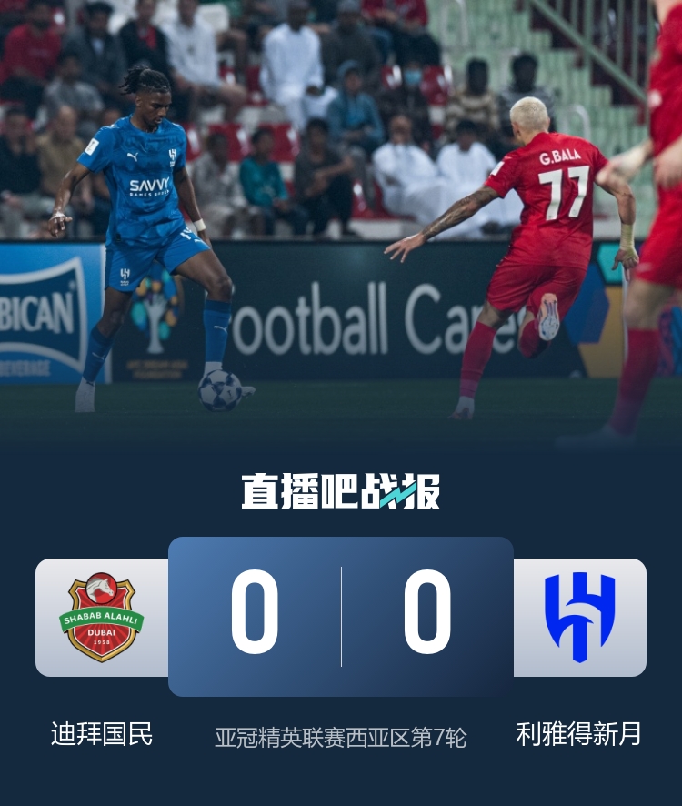 下半场补时4分钟,迪拜青年国民0-0利雅得新月。
