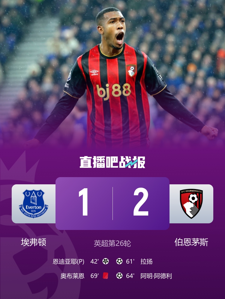 直播吧2月11日讯 北京时间3:30,英超第26轮埃弗顿vs伯恩茅斯,比赛在希尔·迪金森球场打响!上半场,恩迪亚耶越位进球被判无效;拉扬送点,恩迪亚耶点射破门!下半场,拉扬将功补过头球扳平比分!奥布莱恩直红雪上加霜!最终,埃弗顿主场1-2遭伯恩茅斯逆转,英超5轮不败终结;伯恩茅斯英超6轮不败!