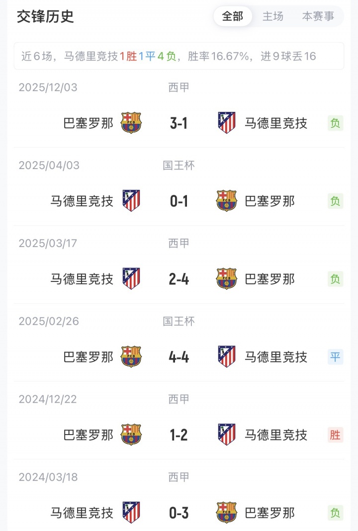 巴萨各赛事对马竞三连胜。上赛季国王杯半决赛,巴萨4-4、1-0淘汰马竞。