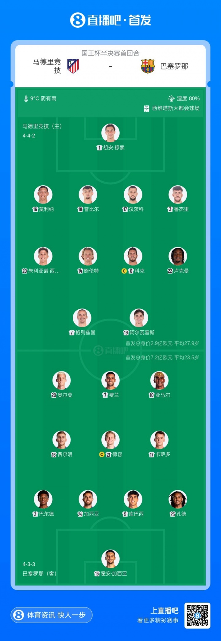 马竞首发:1-穆索、3-鲁杰里、16-莫利纳、17-汉茨科、18-普比尔、6-科克、14-马科斯·略伦特、20-朱利亚诺·西蒙尼、22-卢克曼、7-格列兹曼、19-阿尔瓦雷斯