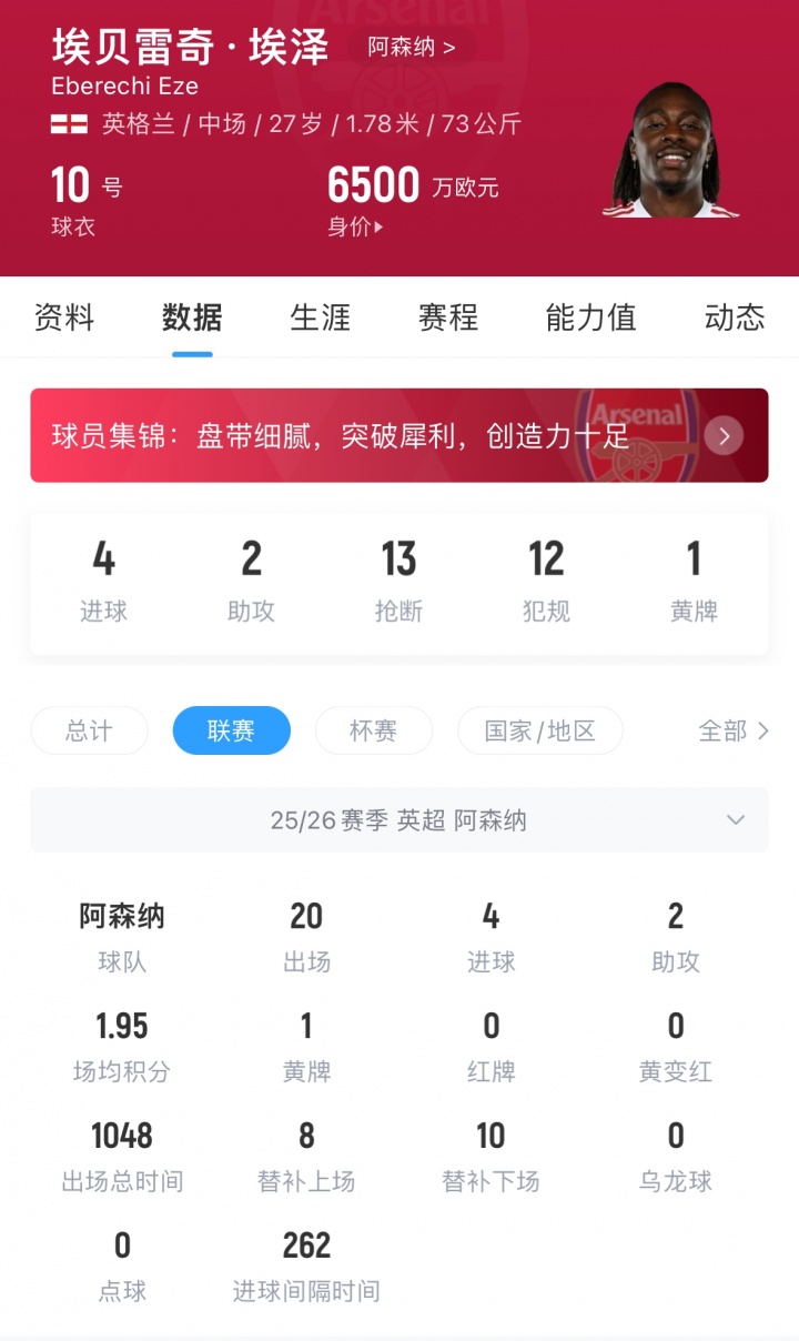 27岁埃泽本赛季为阿森纳出场32次,总出场时间1880分钟,贡献5球4助,现身价6500万欧,他与阿森纳的合同至2029年到期。