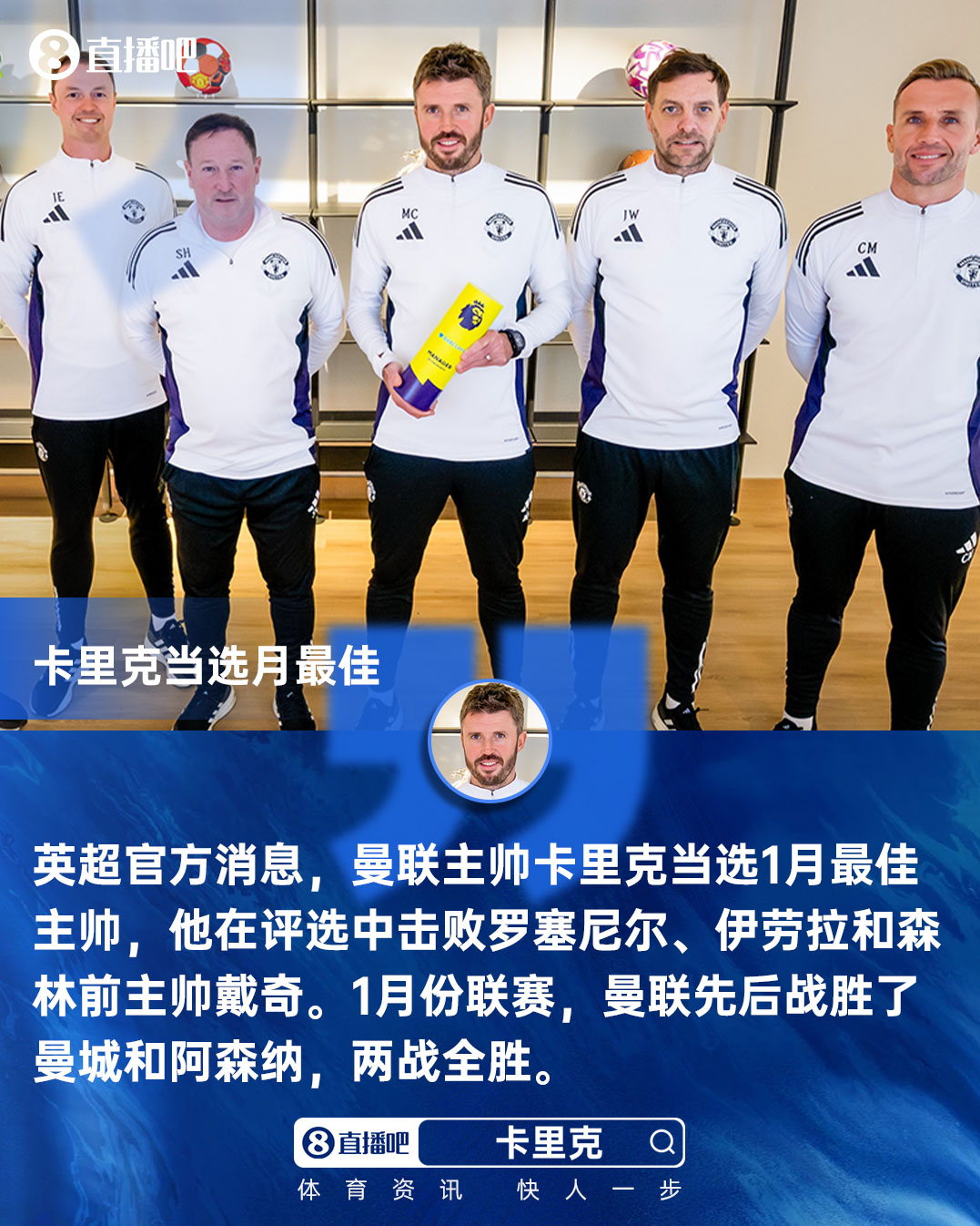 直播吧02月13日讯 英超官方公布了2026年1月的英超月最佳主帅,曼联主帅卡里克当选。卡里克在评选中击败了罗塞尼尔、伊劳拉和森林前主帅戴奇。
