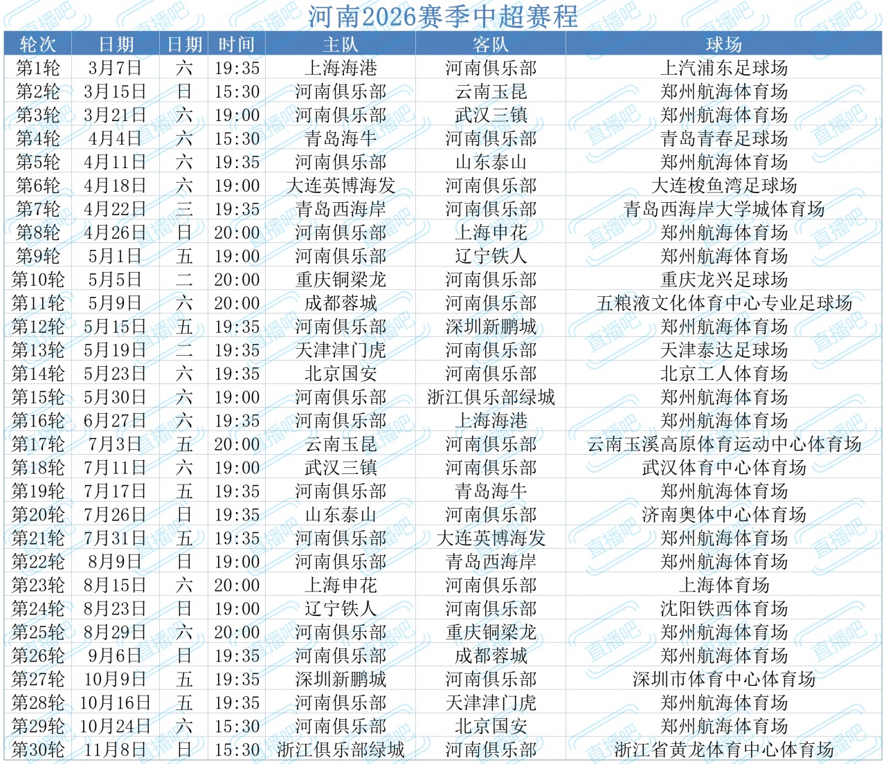 河南2026赛季中超赛程:首轮客战海港,次轮主场对阵云南玉昆
