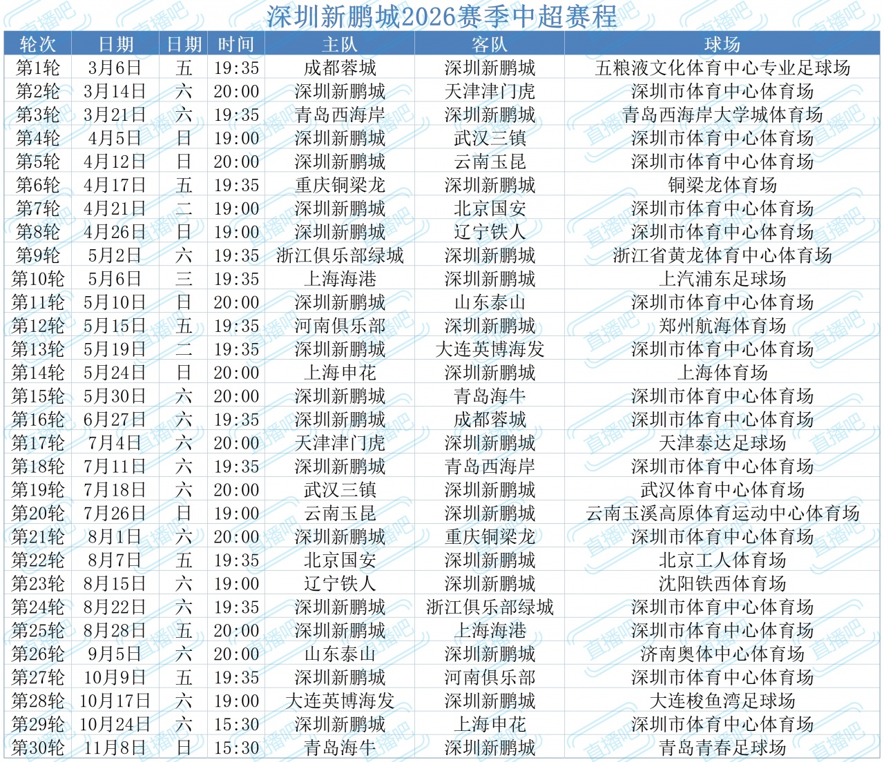 >深圳新鹏城2026赛季中超赛程:首轮客战蓉城,次轮主场对阵津门虎