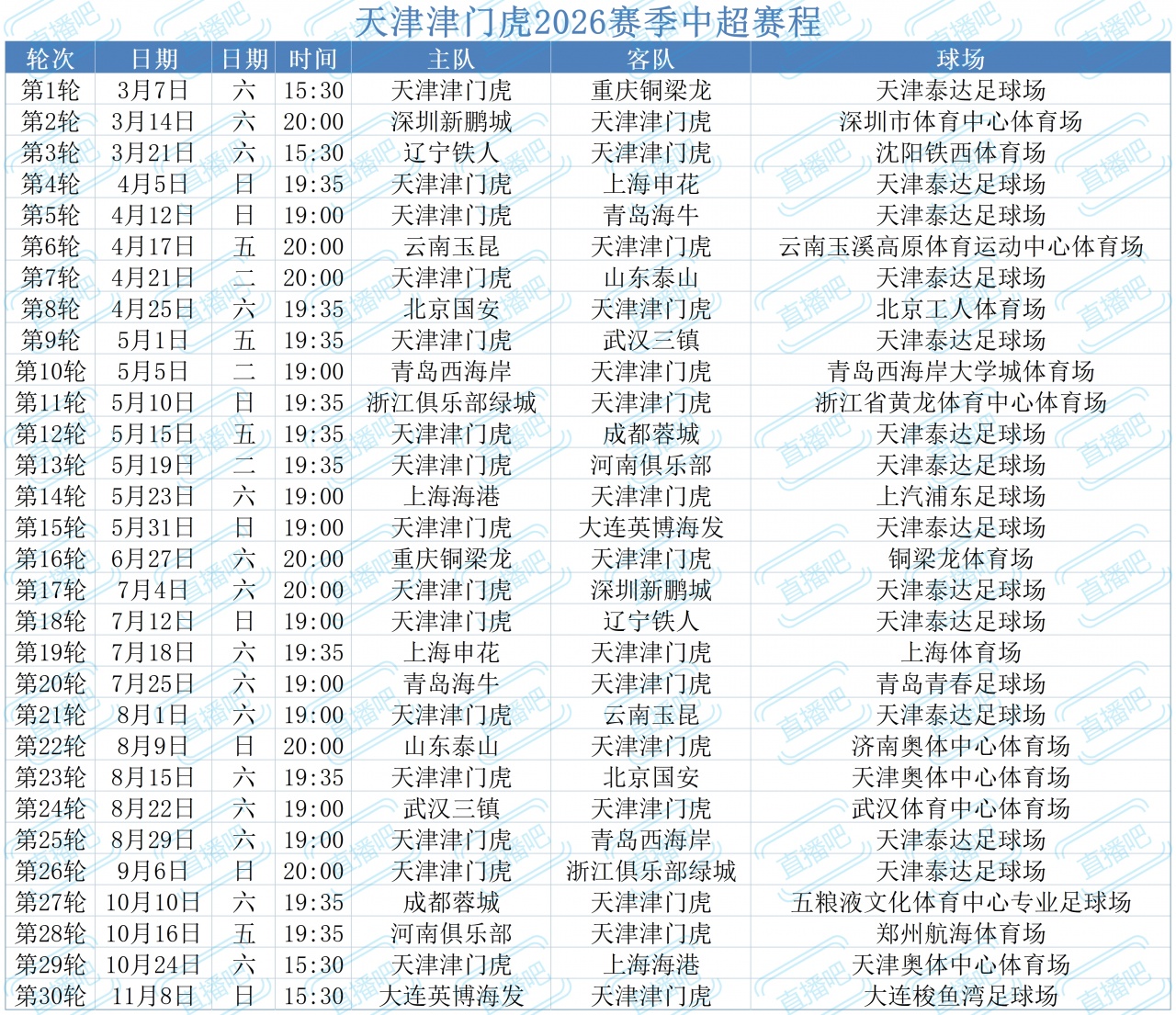 >天津津门虎2026赛季中超赛程:首轮对铜梁龙,7/8轮连战泰山国安