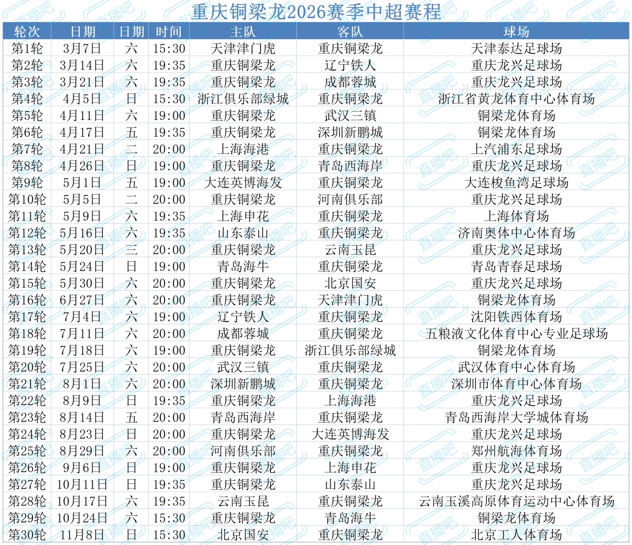 重庆铜梁龙2026赛季中超赛程:前6轮4主场,第7轮客战上海海港