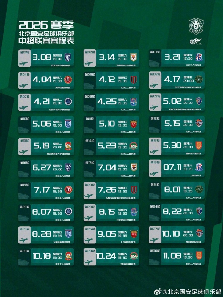 2026赛季中超赛程(北京国安纯享版)