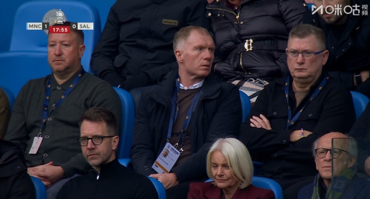 直播吧02月14日讯 曼城vs索尔福德城第18分钟,镜头给到看台,索尔福德城股东斯科尔斯在现场观战。