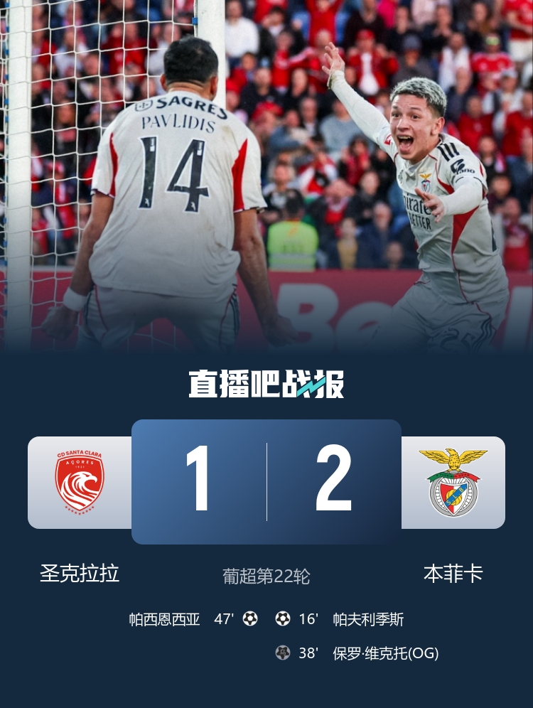 直播吧2月14日讯 葡超联赛第22轮,圣克拉拉在圣米格尔球场迎战本菲卡。上半场,帕夫利季斯进球,维克托自摆乌龙;下半场,帕西恩西亚利用特鲁宾失误扳回一球。最终本菲卡2-1客场击败圣克拉拉。积分榜方面,本菲卡积52分排名第三,圣克拉拉积17分排名第十六。