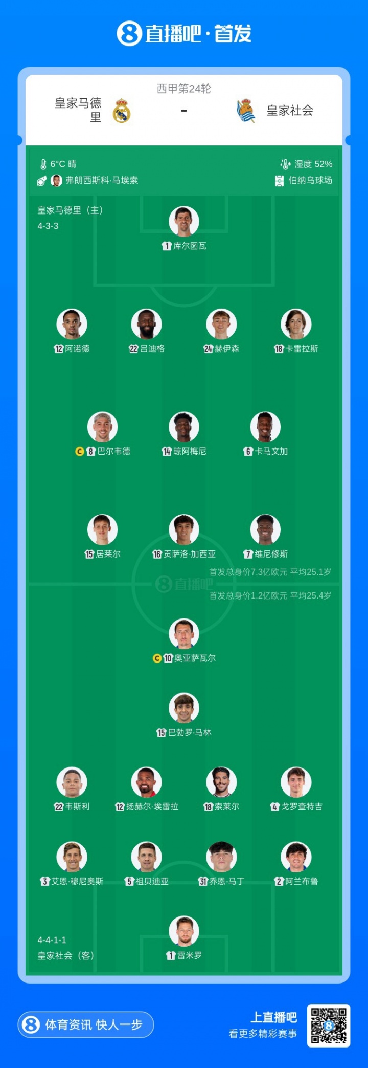 直播吧2月15日讯 西甲第24轮,皇家马德里主场迎战皇家社会,赛前首发名单公布。