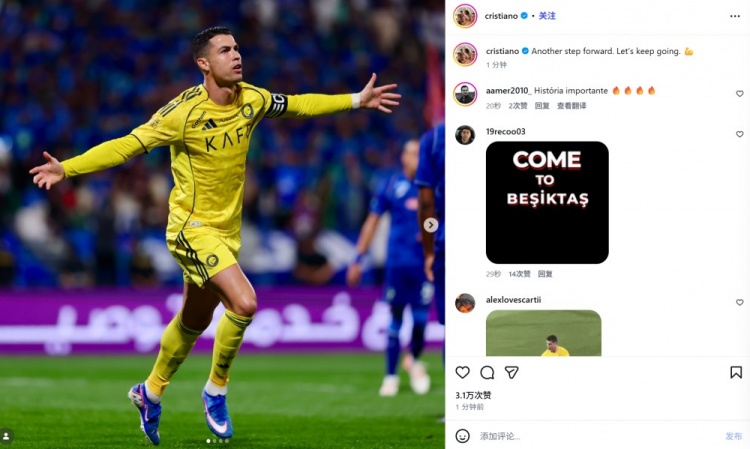 C罗也在赛后通过社媒晒出自己的庆祝照,并配文:“又向前迈出一步!让我们继续下去!”