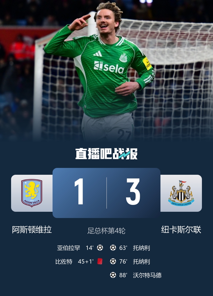直播吧2月15日讯 英格兰足总杯第4轮,阿斯顿维拉在维拉公园球场迎战纽卡斯尔联。上半场,维拉通过精妙任意球配合由亚伯拉罕打进一球,门将比佐特出击犯规破坏墨菲准单刀被直红罚下;下半场,托纳利两脚精彩远射帮助纽卡反超比分,沃尔特马德锁定胜局。最终纽卡斯尔联以3-1逆转客胜维拉,杀进足总杯16强。