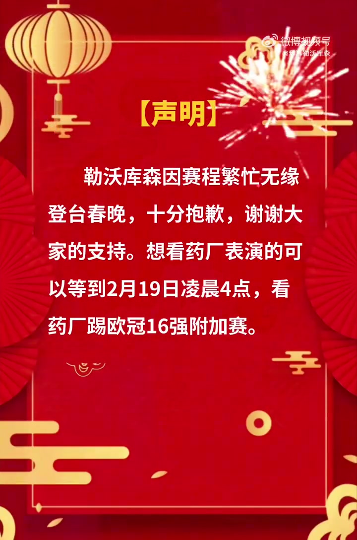 勒沃库森因赛程繁忙无缘登台春晚,十分抱歉,谢谢大家的支持。想看药厂表演的可以等到2月19日凌晨4点,看药厂踢欧冠16强附加赛。