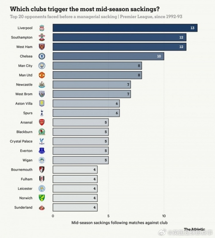 【主帅杀手】TA:英超历史上共有13位主帅在执教球队对阵利物浦后被解雇。