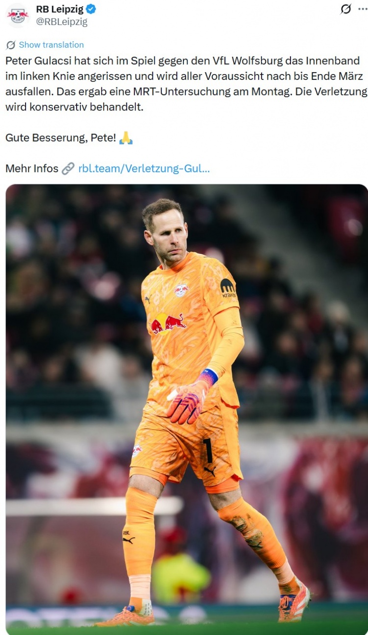 直播吧2月16日讯 莱比锡官方消息,球队门将彼得·古拉茨在对阵沃尔夫斯堡的比赛中左膝内侧韧带撕裂,预计将缺席至三月底。