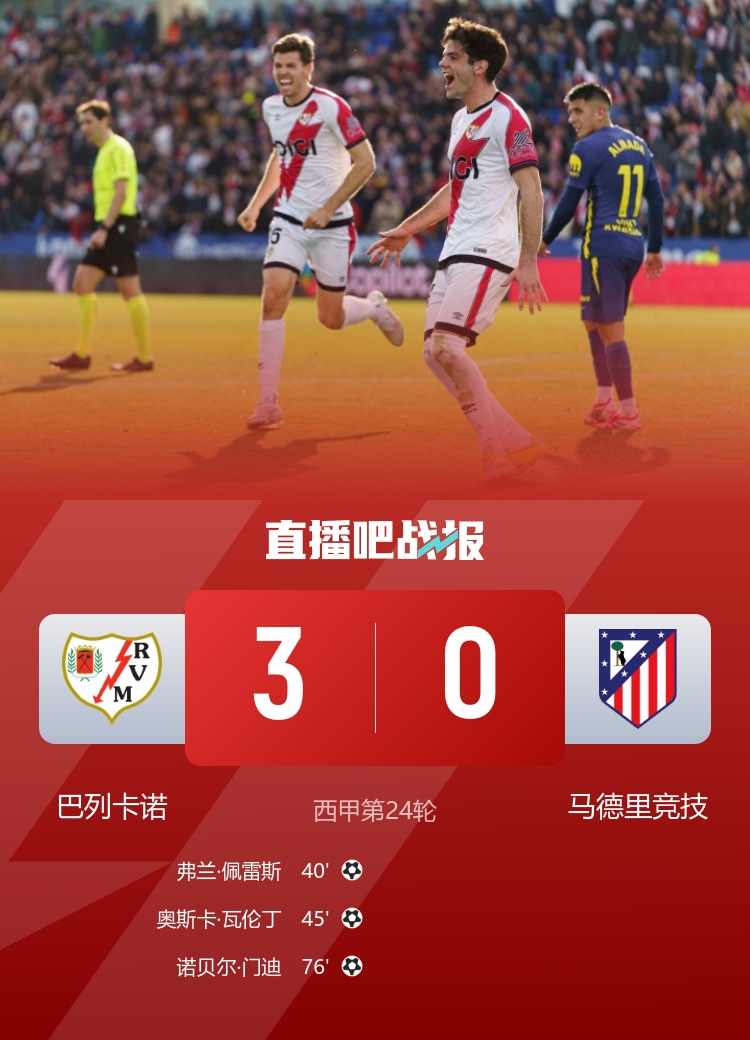 直播吧2月16日讯 北京时间23:15,西甲第24轮巴列卡诺vs马德里竞技,比赛在巴列卡斯球场打响!上半场,马竞在半场尾声阶段连丢2球!弗兰·佩雷斯、奥斯卡·瓦伦丁破门。下半场,诺贝尔·门迪再下一城!最终,马竞客场0-3不敌巴列卡诺,西甲遭遇2连败+4轮不胜,先赛净胜球遭反超,跌至积分榜第4;巴列卡诺终结各项赛事4连败,逃离降级区!