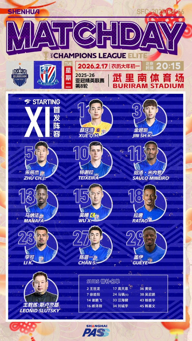 2025/26亚冠精英联赛第8轮武里南联vs上海申花首发名单