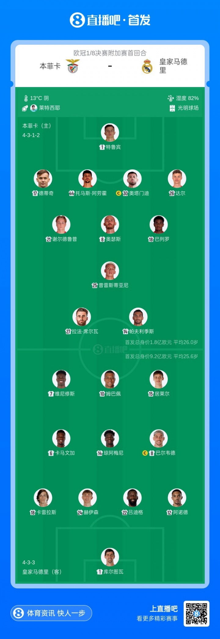 直播吧2月18日讯 欧冠1/8决赛附加赛首回合,皇家马德里客战本菲卡,赛前首发名单公布。联赛阶段末轮两队交手时,本菲卡4-2战胜皇马。【本场比赛姆巴佩和维尼修斯搭档前锋,巴尔韦德回到中场位置。】